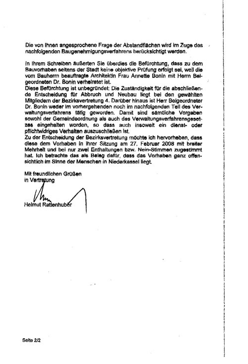 Nun kann man sagen: Was soll´s, schön und erhaltenswert waren sie nicht, also weg damit! Aber leider steckt hinter diesem Abriss mehr, als so mancher Niederkasseler vermuten mag. Der Planungsdezernent Dr.Gregor Bonin stellt der BV 04 den Entwurf seiner als Architektin tätigen Ehefrau als ein dem dörflichen Charakter angemessene Bebauung vor, und ein Großteil unserer Lokalpolitiker stimmt dem kritiklos zu! Ein „Einfamilienhaus" ist in der Planung, das den gültigen Bebauungsplan um ein mehrfaches überschreitet. Es gelten keine Baugrenzen und -linien, vorgegebene Trauf- und Firsthöhen werden um ein Vielfaches überschritten; Nachbarinteressen werden nicht berücksichtigt (oder erkauft!?)! Die vor Jahren mühsam erreichte Erhaltungssatzung ist keinen Pfifferling mehr wert! Und all das, um ureigenste private Interessen eines Bauherrn zu befriedigen. Dieser leichtsinnige Akt von Verwaltung und Politik hat nachhaltige Folgen: Es ist der „Fuß in der Tür" derjenigen, die mit ihren Grundstücksspekulationen im Dorf eine „schnelle Mark" machen wollen. Der VVV hat aus diesem Grund eine Dienstaufsichtsbeschwerde an den Oberbürgermeister gerichtet. Diese wurde bis heute nicht zu Kenntnis genommen.
