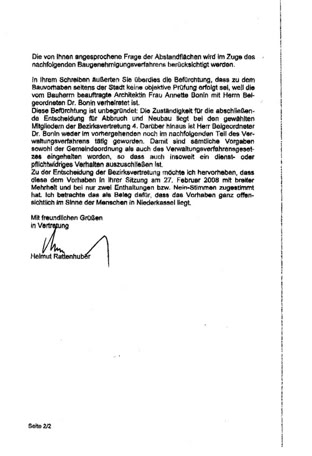 Die Zustimmung der BV4 zu der ihr von der Verwaltung vorgelegten Bauvoranfrage veranlasste den VVV zu einer Dienstaufsichtsbeschwerde mit folgender Begründung: