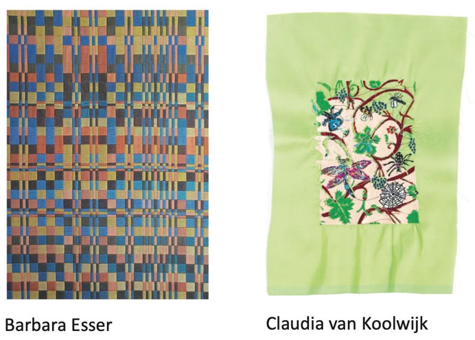 Barbara Essers Arbeiten erweitern die Ausstellung durch ihre konstruierten Gewebe und textilen Farbrasterungen.