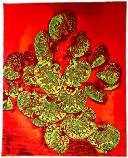 Tina Eggert hat immer die neusten Techniken in der Fotografie ausprobiert und in ihrem Sinne eingesetzt. Schon vor Jahren hat sie zusammen mit einem Teppichproduzenten ein bestimmtes Verfahren zum Bedrucken von Teppichen weiter entwickelt und nun sind die leuchtenden Ergebnisse in der Ausstellung zu sehen. Der Charakter der Blüten wird sichtbar und Details, die sonst nicht wahrgenommen werden, sind in den Fokus gesetzt.