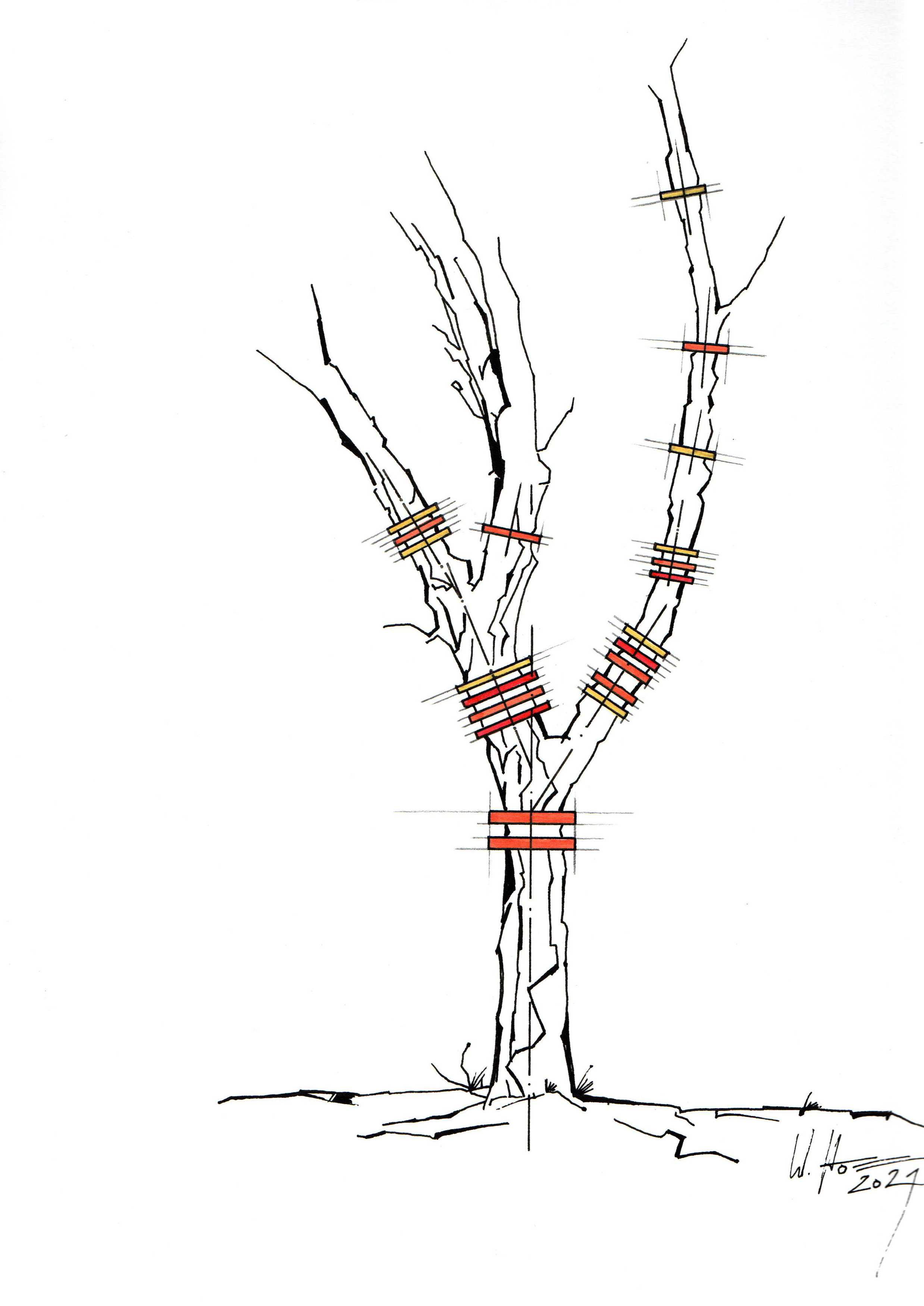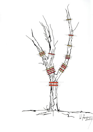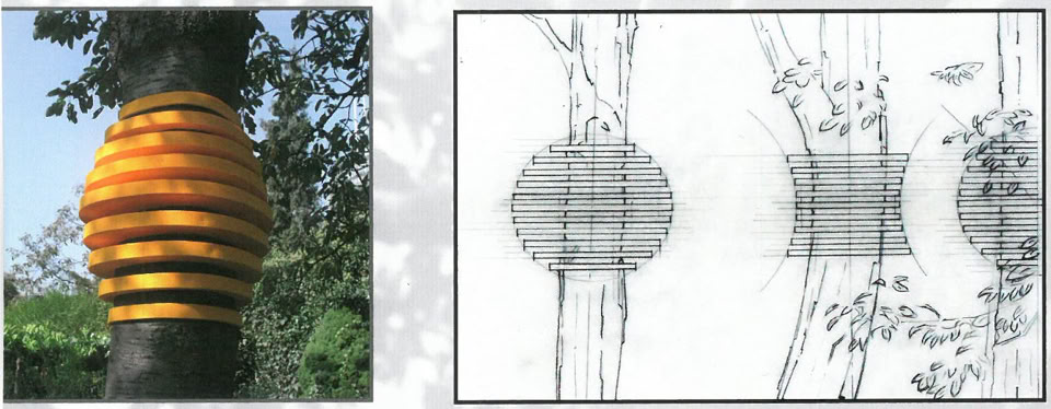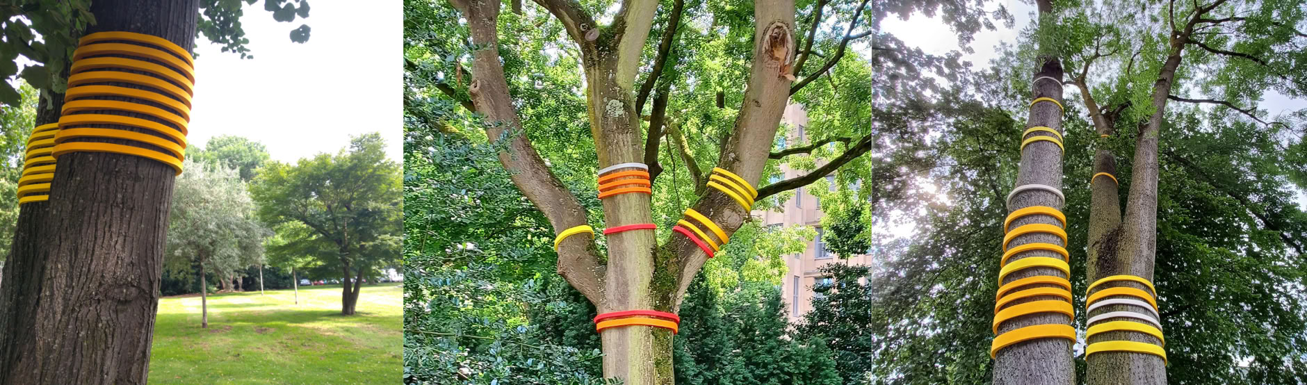 Neben den natürlichen können den Bäumen auch textile Geäste entspringen. Fächerförmige Fadengrafiken, ähnlich der Fadenführung in der Weberei (in der übrigens ein „Baum“ Teil des Webstuhles ist), verleihen den Bäumen eine scheinbar selbstverständliche Dynamik, und das Zusammenspiel von Stamm, Ästen, Blättern und verspannten Fäden verwandelt die Bäume in ungewöhnliche, reiche Bildwerke. Skulptural auch die Gurtlagen, die bisweilen den Baumstamm in etwas verwandeln, das einer Säule ähnelt. Doch die Textilhaut passt sich dem Baumstamm an, Naturform und architektonisches Element verbinden sich harmonisch. Lamellenförmige Oberflächen können dabei die Wahrnehmung dynamisieren, standortabhängig entstehen offene und geschlossene Oberflächen.