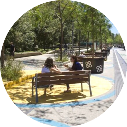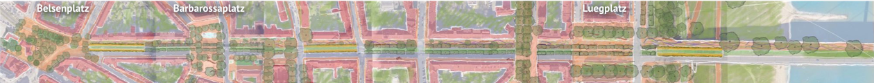 Das Blau - Grüne Band: Auf dem nördlichen Teil der Luegallee vom Luegplatz bis zum Belsenplatz entstehen Nachbarschaftszonen, breite Vorgärten, kleine Parks mit schattenspendender Bepflanzung.
