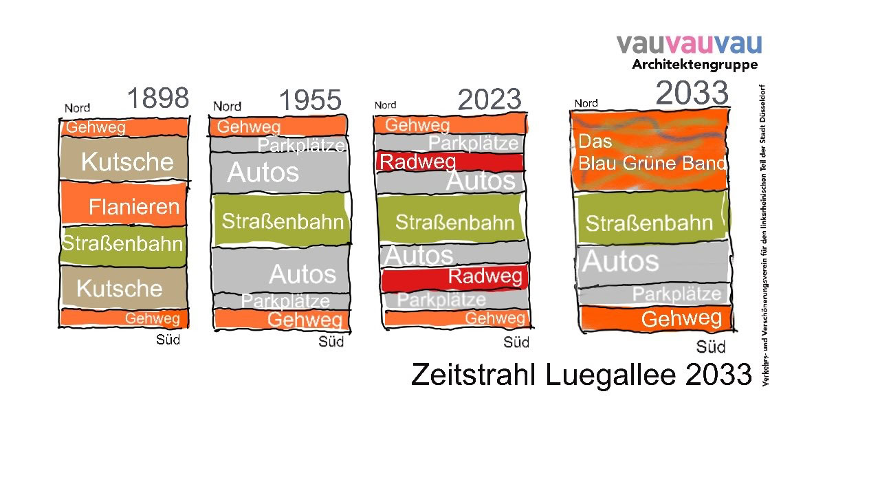 Und wenn wir schon beim Zurückschauen sind, die Luegallee hat sich schon immer geändert: 1898 wurde auf der Luegallee neben Straßenbahn und Kutsche eine breite Flanierzone eingerichtet. 1955 wurde sie dann autogerecht. Flanieren wich dem Autofahren, die Plätze wurden getrennt. Nun ist es wieder an der Zeit, den Status quo hinter sich zu lassen und zum Wohle des Klim