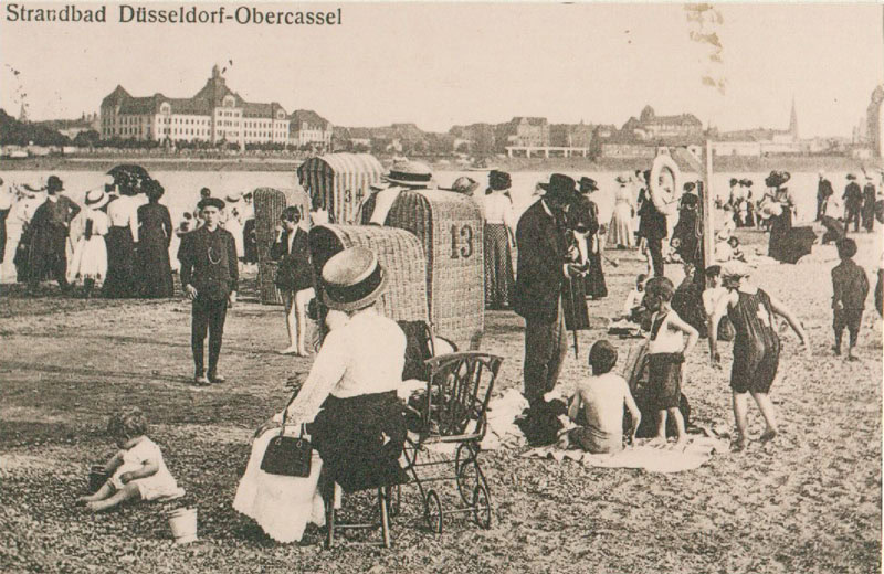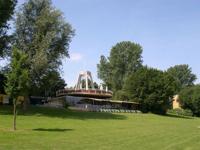 Eingebettet in ein Stück typischer niederrheinischer Landschaft stehen die Gebäude des ersten Bauabschnitts im Hintergrund und reihen sich parallel zum See entlang des Damms. Die organischen Formen der Parklandschaft stehen in spannungsreichem Kontrast zur klaren Linie der Architektur, die nicht nur in der Anordnung, sondern auch durch ihre formale Erscheinung die Spannung verstärkt. Klar geschnittene, einfache Kuben der Umkleidekabinen verbunden mit einer durchgehenden Wegüberdachung sprechen die Architektursprache der Zeit. Mit einem Augenzwinkern gaukeln sie zum Weg hin mit ihrer Holzverschalung einfacher Bootsschuppen vor, die von flügelartigen Fensteraufbauten gekrönt sind. Über die Treppenabgänge zum Strand hin wird jeder einzelne Schritt mit Bedacht in die Parkanlage geführt. Folgt man dem überdachten Weg, so wird man feststellen, dass die wechselnden Ausblicke, mal vom Rhein weg in die Landschaft, mal auf den See, ganz bewusst die Landschaft vorführen. Der am Endpunkt des Weges errichtete Turm bildet einen fröhlichen Abschluss, einer kühnen Sandburg ähnlich ist er das abschließende Symbol der Sommerfrische.