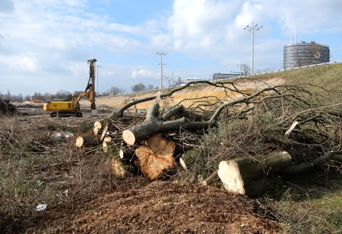 2020: Fällungen von 31 Bäumen für das Regenklär- und Regenrückhaltebecken am Simon-Garzweiler-Platz.
